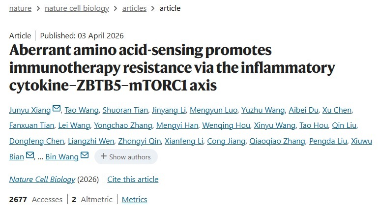 [2] Xiang J, Wang T, Tian S, et al. Aberrant amino acid-sensing promotes immunotherapy resistance via the inflammatory cytokine-ZBTB5-mTORC1 axis. Nat Cell Biol. Published online April 3, 2026. doi:10.1038/s41556-026-01926-8